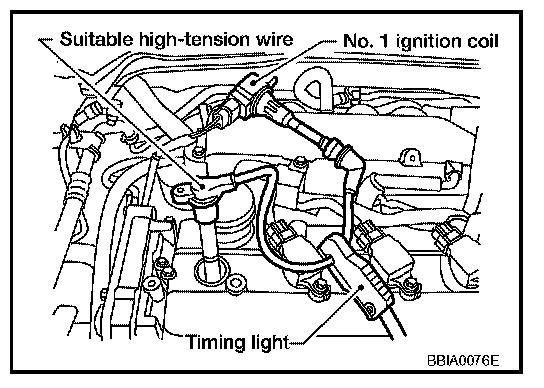 2. Connect No. 1 ignition coil and No. 1 spark plug with suitable high-tension wire as shown, and attach timing light clamp to this wire.