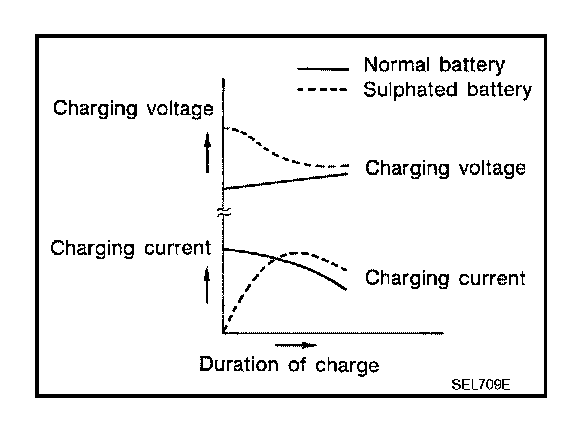 To determine if a battery has been "sulphated", note its voltage and current when charging it. As shown in the figure, less current and higher voltage are observed in the initial stage of charging sulphated batteries.