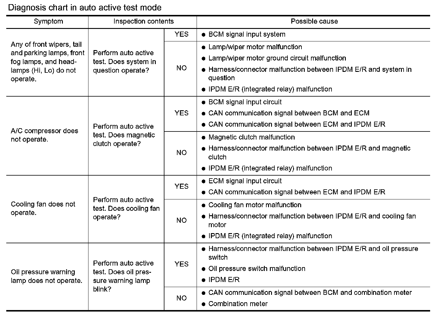 - If any of the systems controlled by IPDM E/R cannot be operated, possible cause can be easily diagnosed using auto active test.