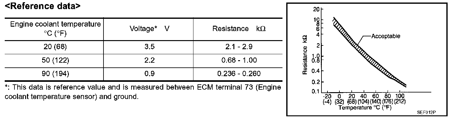The engine coolant temperature sensor is used to detect the engine coolant temperature. The sensor modifies a voltage signal from the ECM. The modified signal returns to the ECM as the engine coolant temperature input. The sensor uses a thermistor which is sensitive to the change in temperature. The electrical resistance of the thermistor decreases as temperature increases.