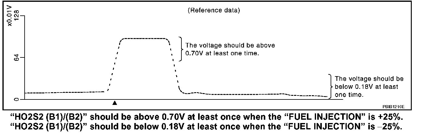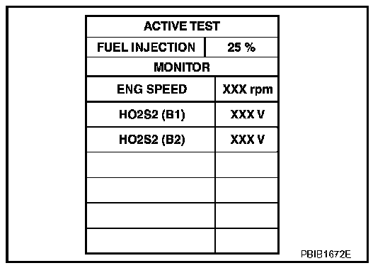 7. Check "HO2S2 (B1)/(B2)" at idle speed when adjusting "FUEL INJECTION" to ±25%.