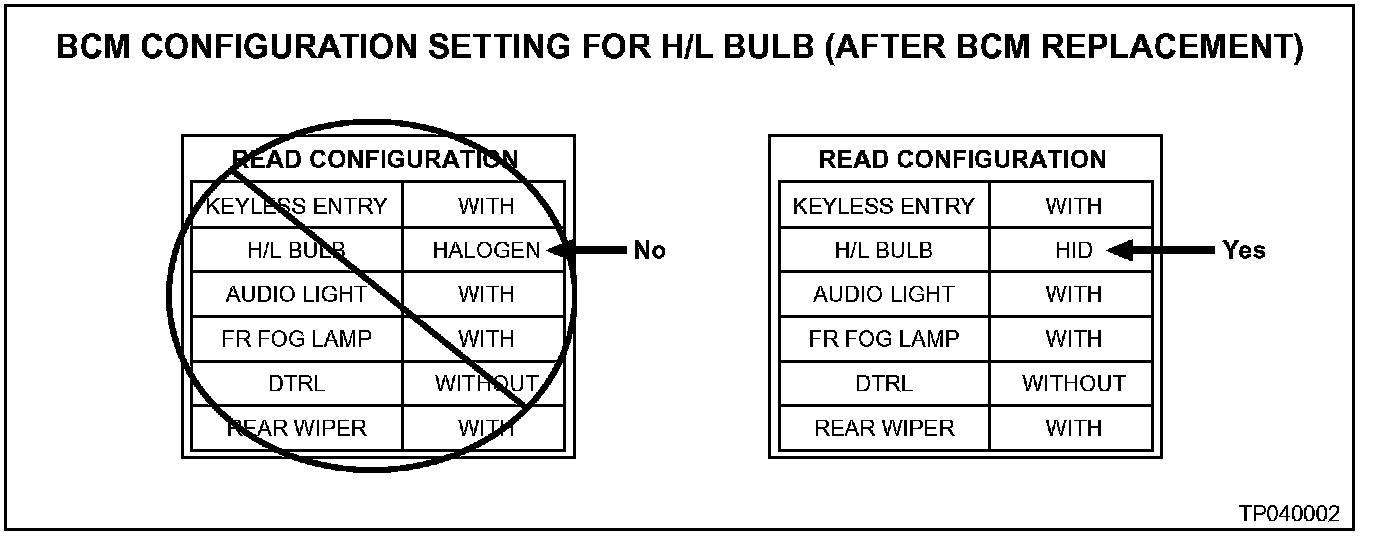 If, for any reason, you have to replace the BCM in an applied vehicle, please note that the H/L Bulb configuration (for the new BCM) must be set to "HID". It doesn't matter if the vehicle is equipped with Halogen or Xenon headlamps.
