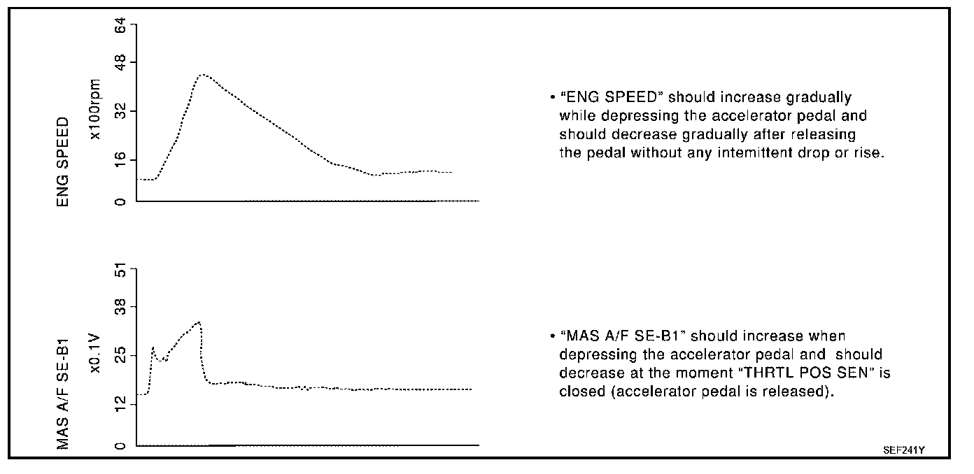 The signal of "ACCEL SEN 1" and "THRTL SEN 1" should rise gradually without any intermittent drop or rise after "CLSD THL POS" is changed from "ON" to "OFF".