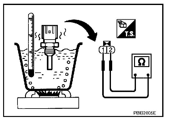 1. Check resistance between engine coolant temperature sensor terminals 1 and 2 as shown in the figure.