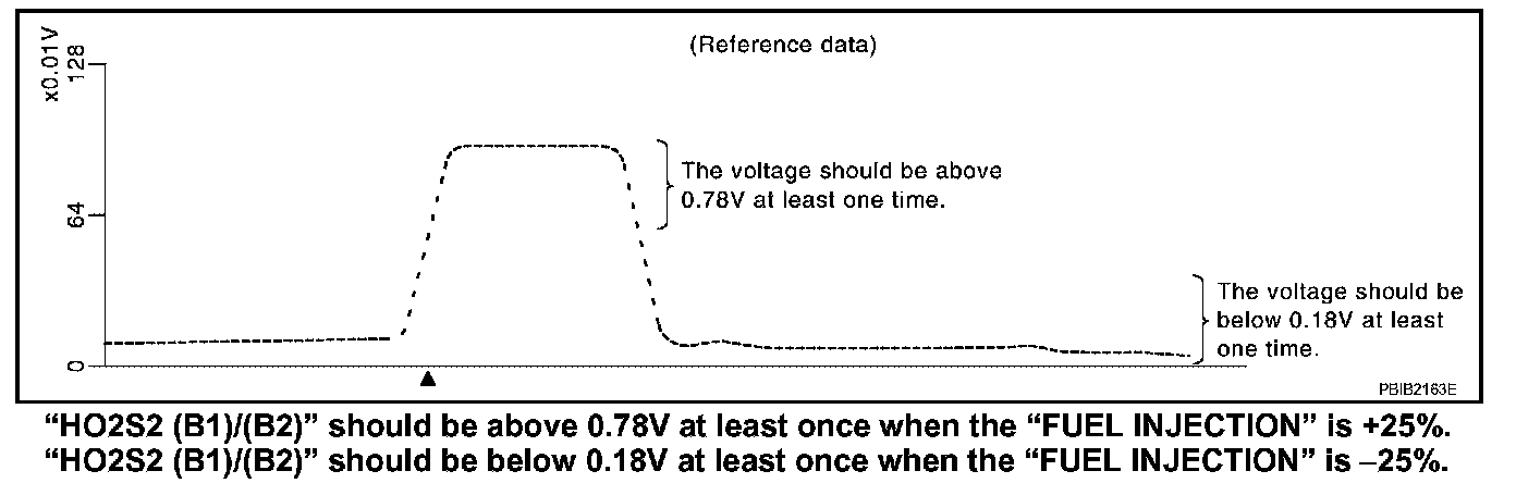 7. Check "HO2S2 (B1)/(B2)" at idle speed when adjusting "FUEL INJECTION" to ±25%.