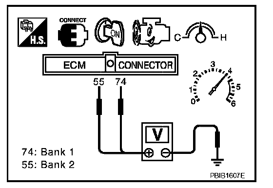 5. Set voltmeter probes between ECM terminal 74 [HO2S2 (B1) signal] or 55 [HO2S2 (B2) signal] and ground.