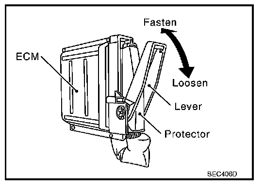 - When connecting ECM harness connector, fasten it securely with levers as far as they will go as shown in the figure.
