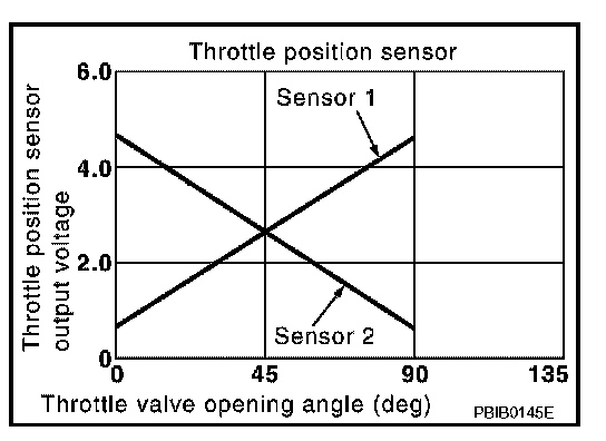 The throttle position sensor has the two sensors. These sensors are a kind of potentiometers which transform the throttle valve position into output voltage, and emit the voltage signal to the ECM. In addition, these sensors detect the opening and closing speed of the throttle valve and feed the voltage signals to the ECM. The ECM judges the current opening angle of the throttle valve from these signals and the ECM controls the throttle control motor to make the throttle valve opening angle properly in response to driving condition.