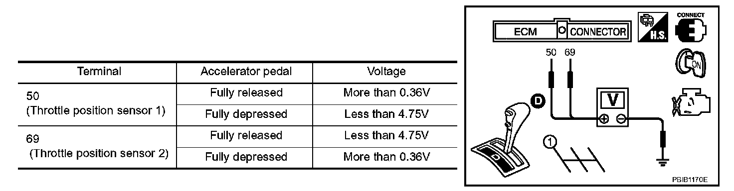 5. Check voltage between ECM terminals 50 (TP sensor 1 signal), 69 (TP sensor 2 signal) and ground under the given conditions.