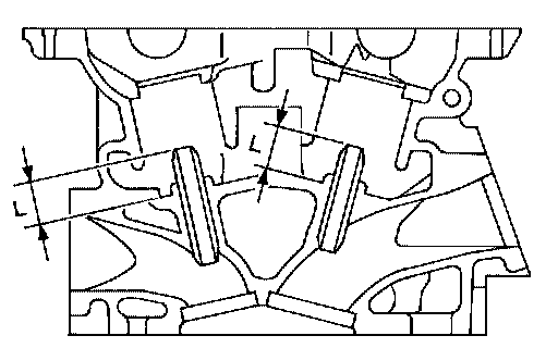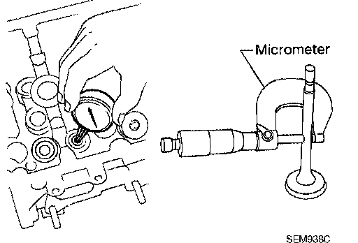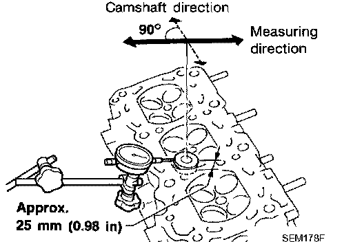 1. Measure valve deflection as shown. (Valve and valve guide mostly wear in this direction.)