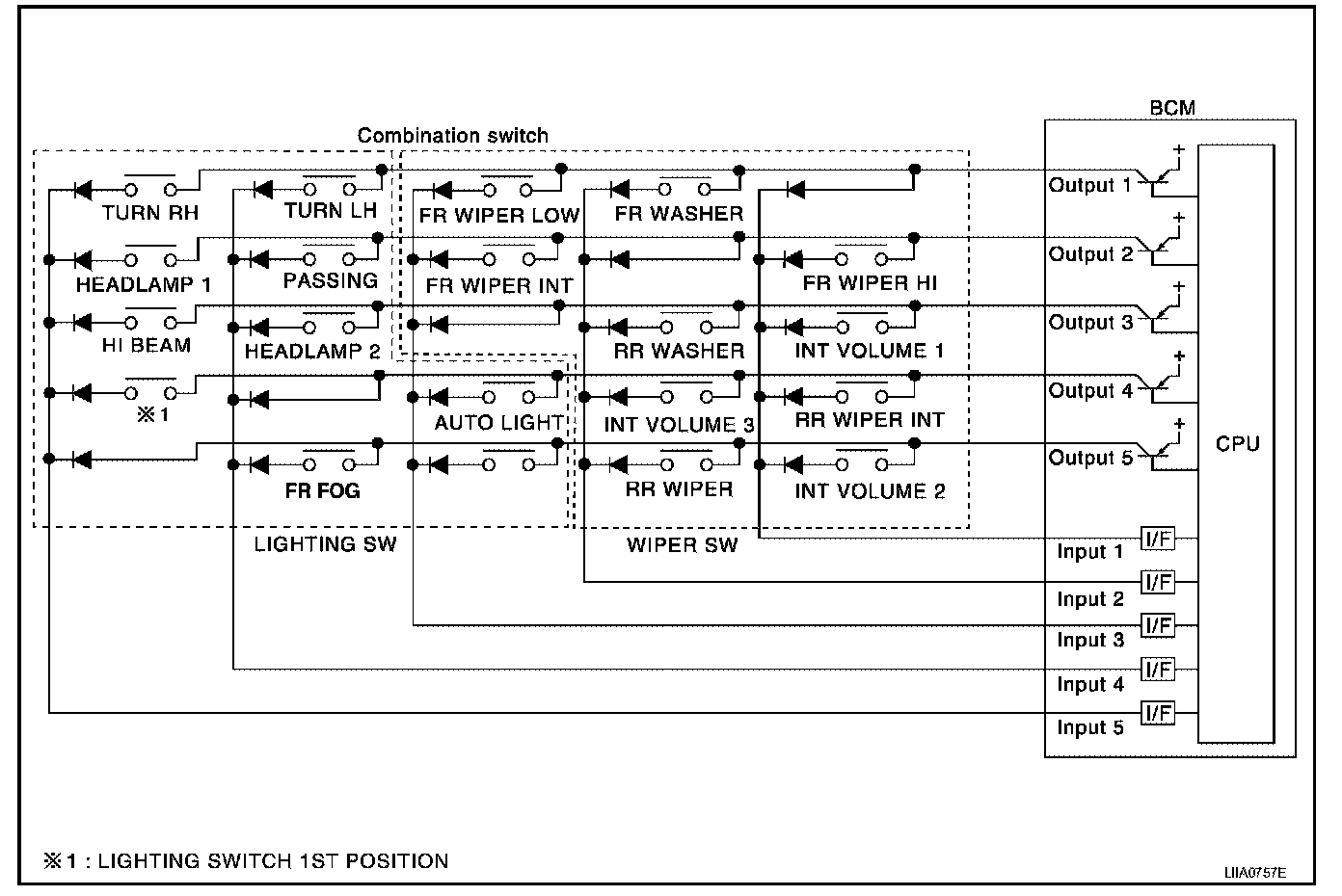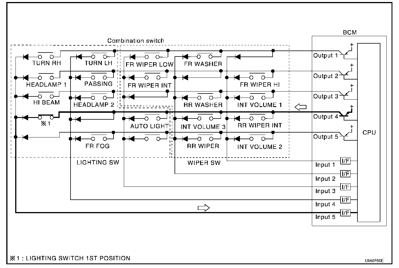 - When lighting switch 1st position is turned ON, contact in combination switch turns ON. At this time if OUTPUT 4 transistor is activated, BCM detects that voltage changes in INPUT 5.