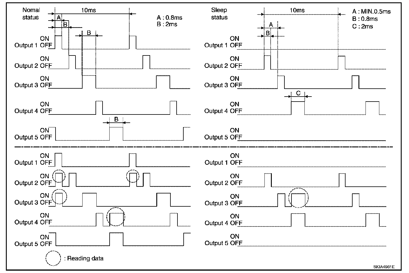 - When BCM is not in sleep status, OUTPUT terminals (1-5) each turn ON-OFF every 10 ms.