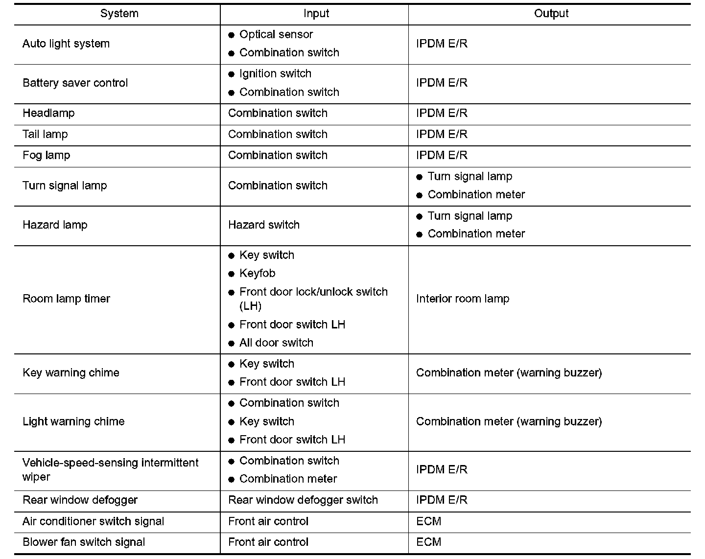 BCM has a combination switch reading function for reading the operation of combination switches (light, wiper washer, turn signal) in addition to the function for controlling the operation of various electrical components. Also, it functions as an interface that receives signals from the A/C control unit, and sends signals to ECM using CAN communication.