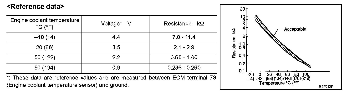 The engine coolant temperature sensor is used to detect the engine coolant temperature. The sensor modifies a voltage signal from the ECM. The modified signal returns to the ECM as the engine coolant temperature input. The sensor uses a thermistor which is sensitive to the change in temperature. The electrical resistance of the thermistor decreases as temperature increases.
