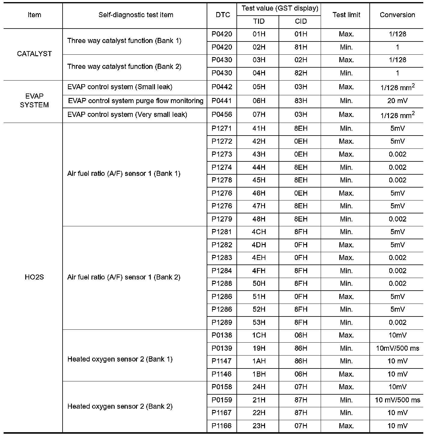 The test value is a parameter used to determine whether a system/circuit diagnostic test is OK or NG while being monitored by the ECM during self-diagnosis. The test limit is a reference value which is specified as the maximum or minimum value and is compared with the test value being monitored.