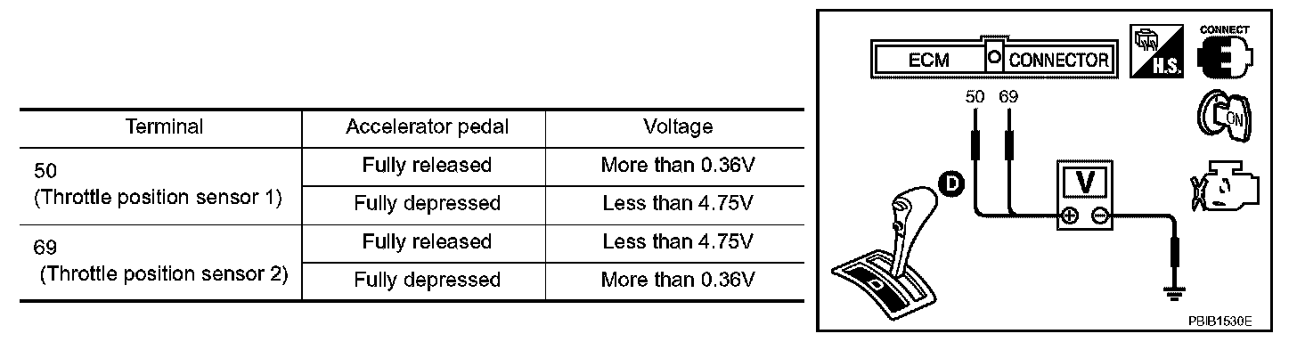 5. Check voltage between ECM terminals 50 (TP sensor 1 signal), 69 (TP sensor 2 signal) and ground under the given conditions.