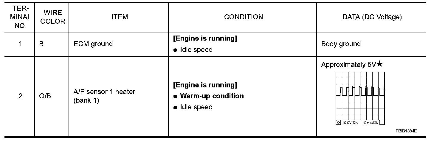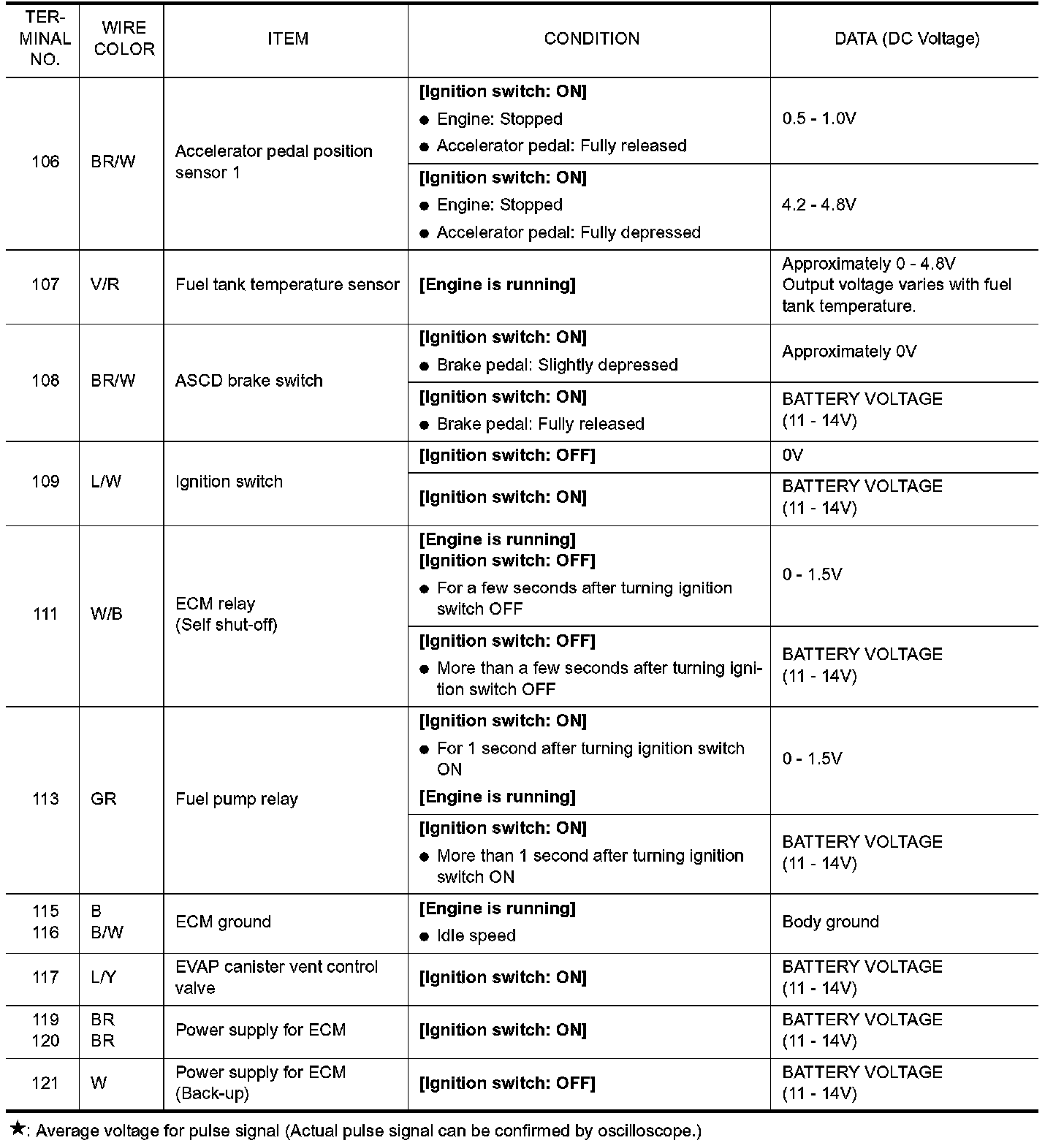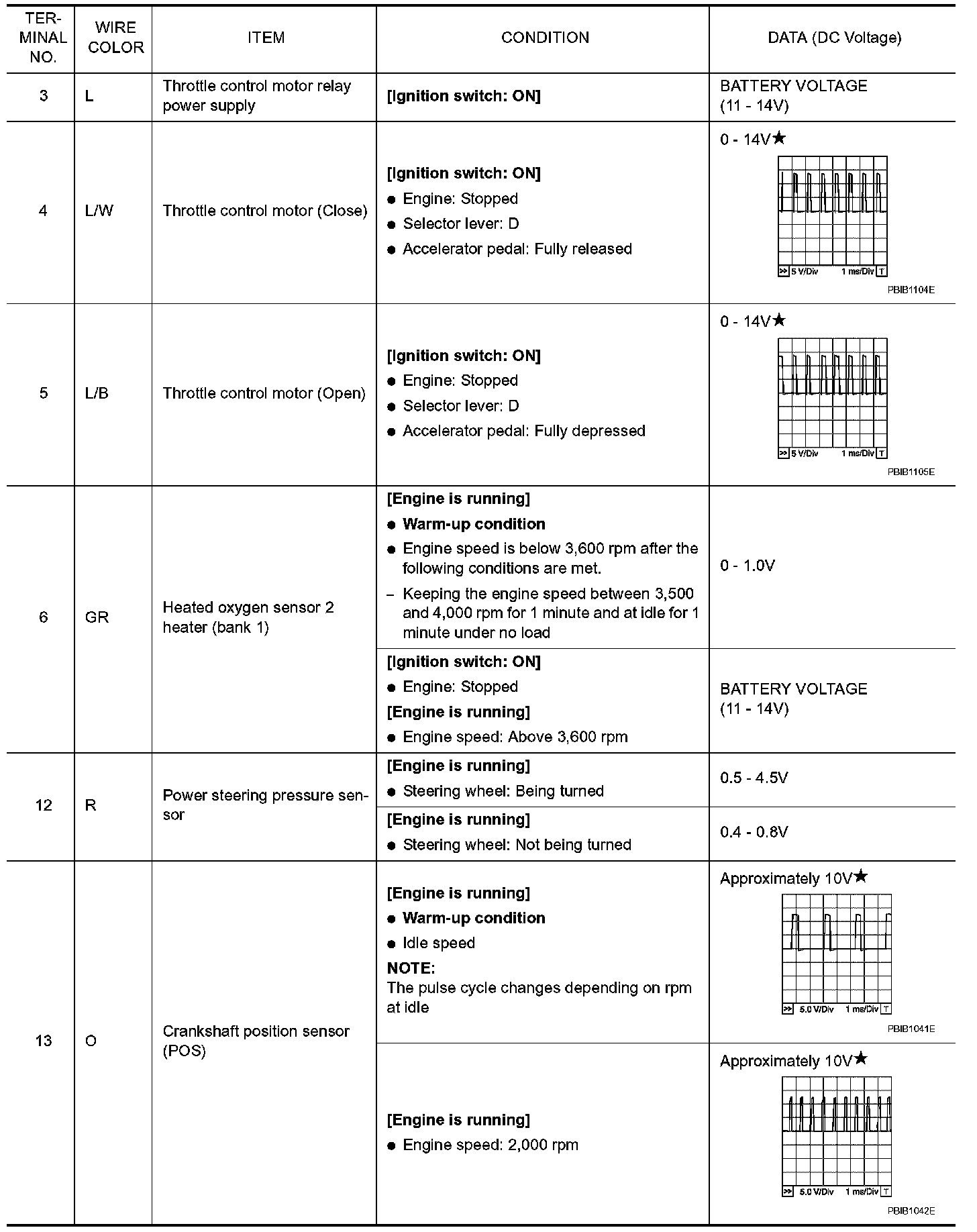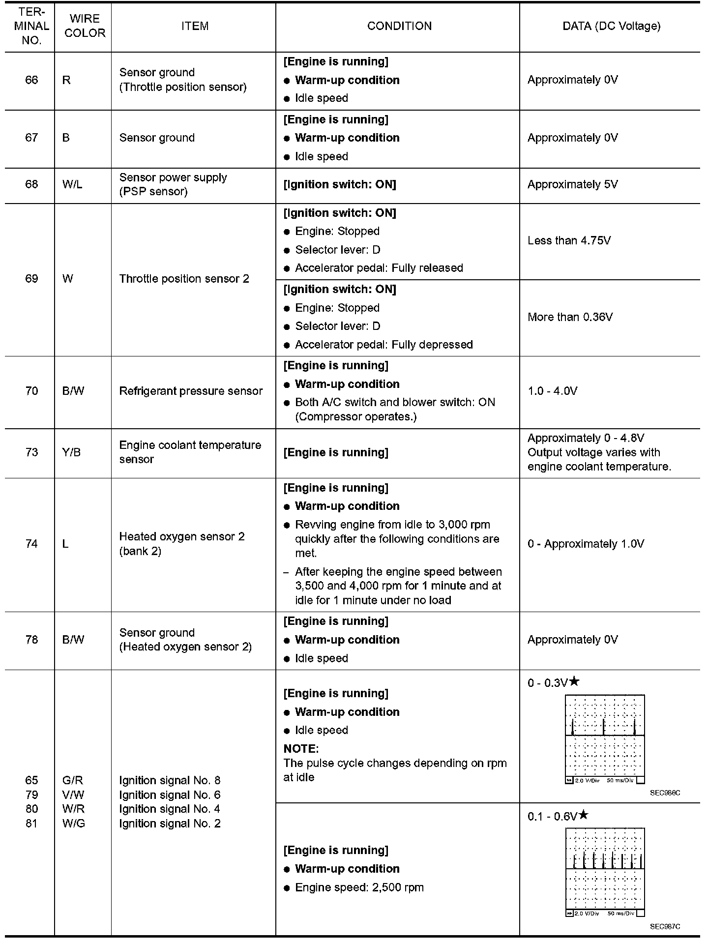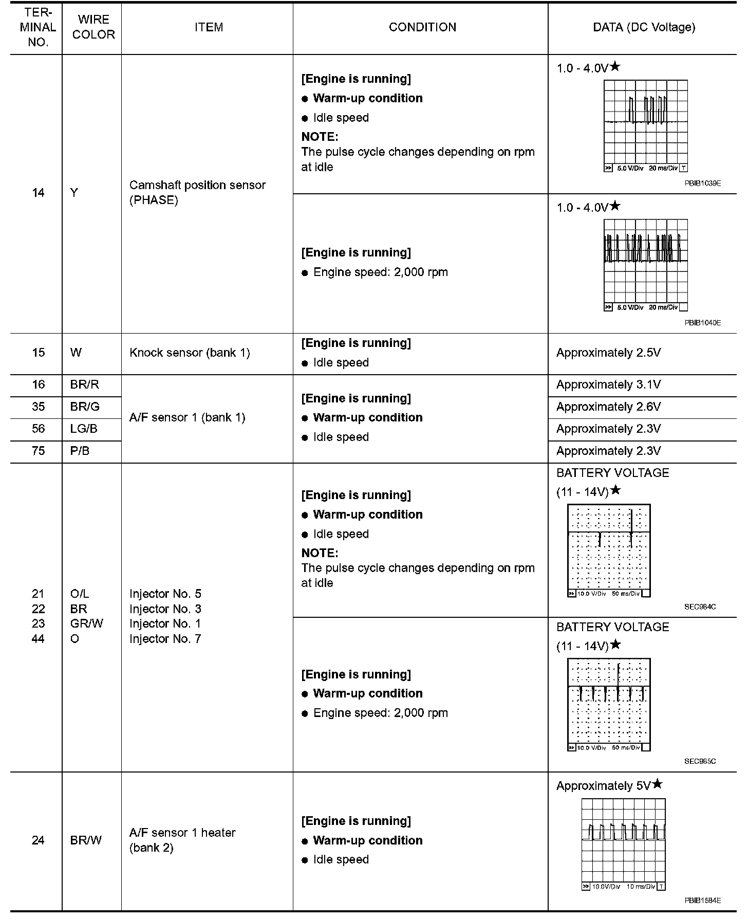 Specification data are reference values and are measured between each terminal and ground. Pulse signal is measured by CONSULT-II.