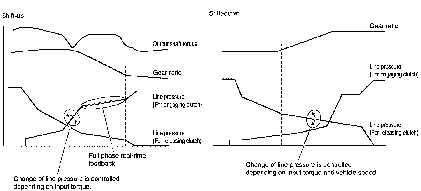 *1: Full phase real-time feedback control monitors movement of gear ratio at gear change, and controls oil pressure at real-time to achieve the best gear ratio.