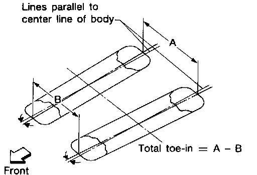 6. Measure the distance "B" on the front side of the front tires at the same marks as shown. Total toe-in is calculated as "A" - "B".