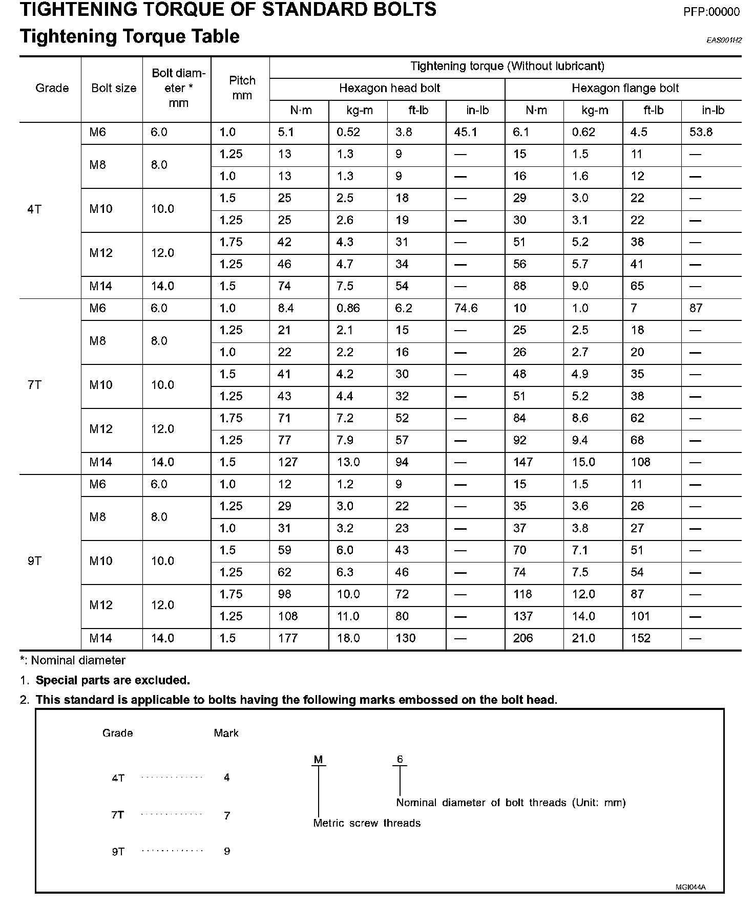 Tightening Torque Of Standard Bolts: