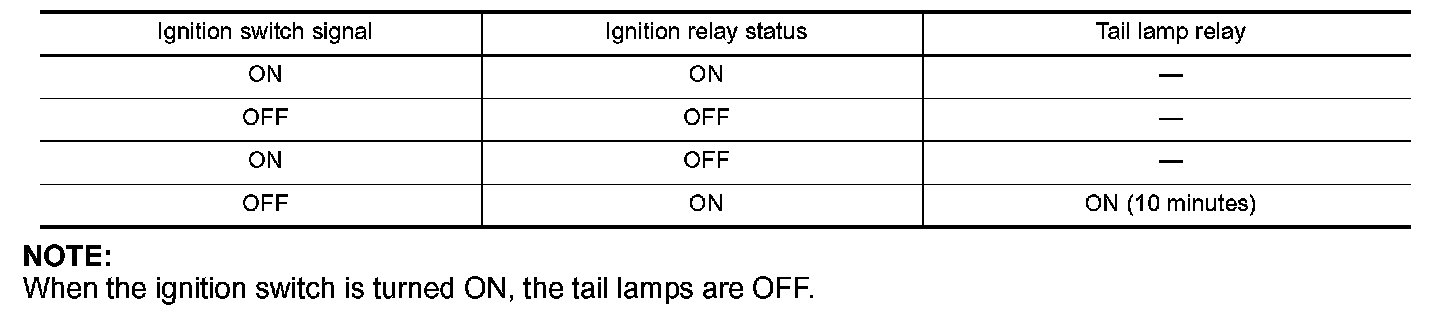- When the state of the integrated ignition relay does not agree with the state of the ignition switch signal received via CAN communication, the IPDM E/R activates the tail lamp relay.