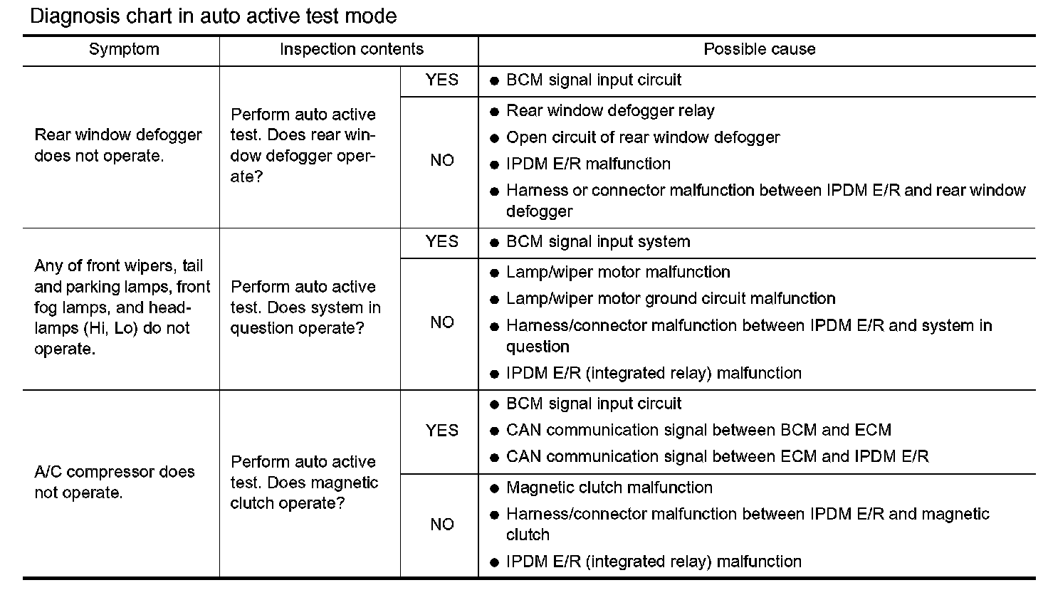 - If any of the systems controlled by IPDM E/R cannot be operated, possible cause can be easily diagnosed using auto active test.