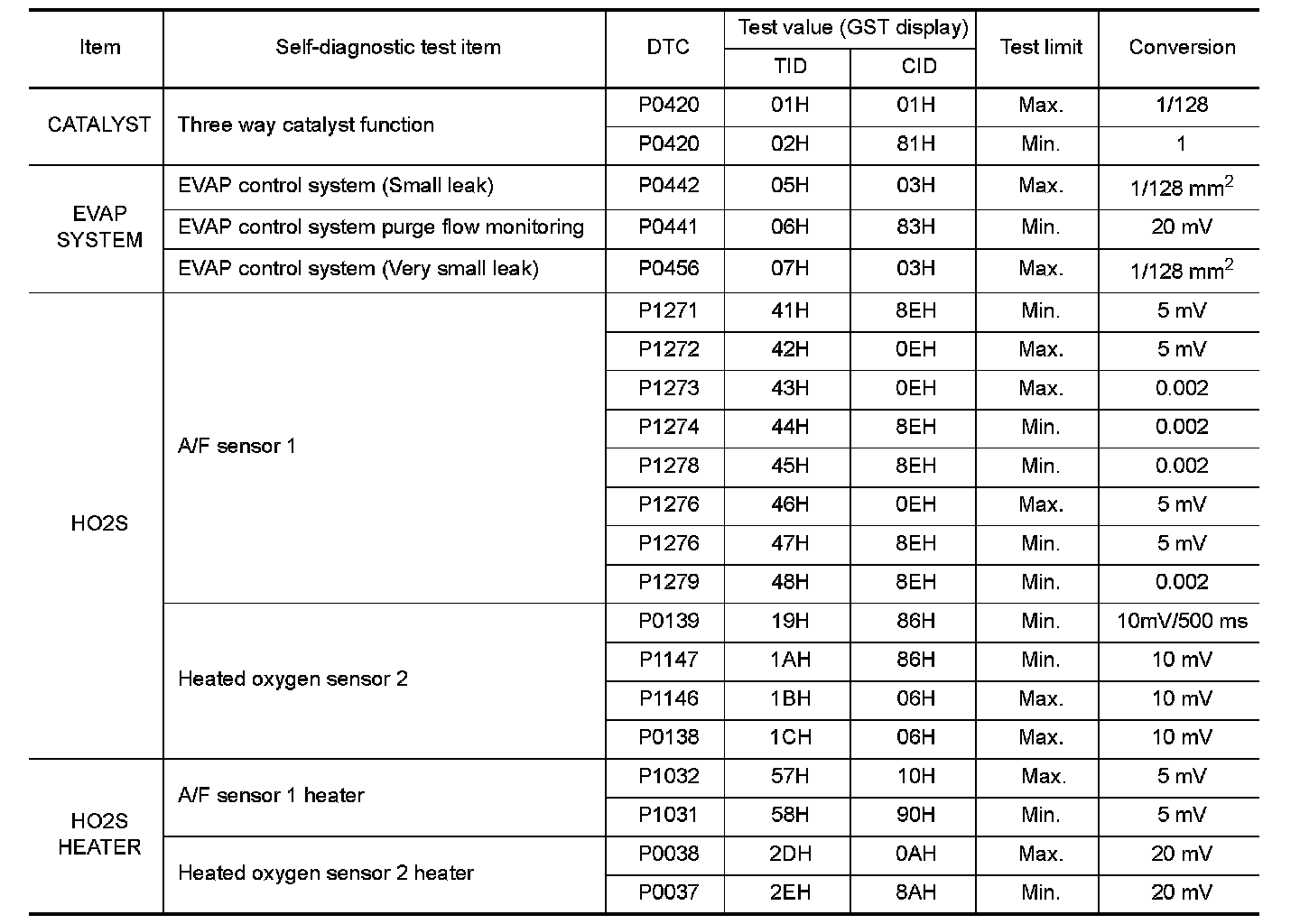 The test value is a parameter used to determine whether a system/circuit diagnostic test is "OK" or "NG" while being monitored by the ECM during self-diagnosis. The test limit is a reference value which is specified as the maximum or minimum value and is compared with the test value being monitored.
