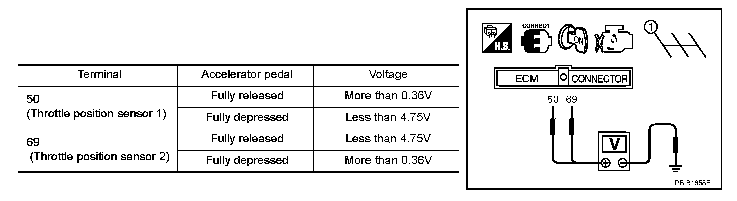 5. Check voltage between ECM terminals 50 (TP sensor 1 signal), 69 (TP sensor 2 signal) and ground under the given conditions.