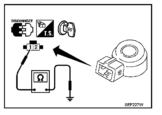 Check resistance between knock sensor terminal 1 and ground.