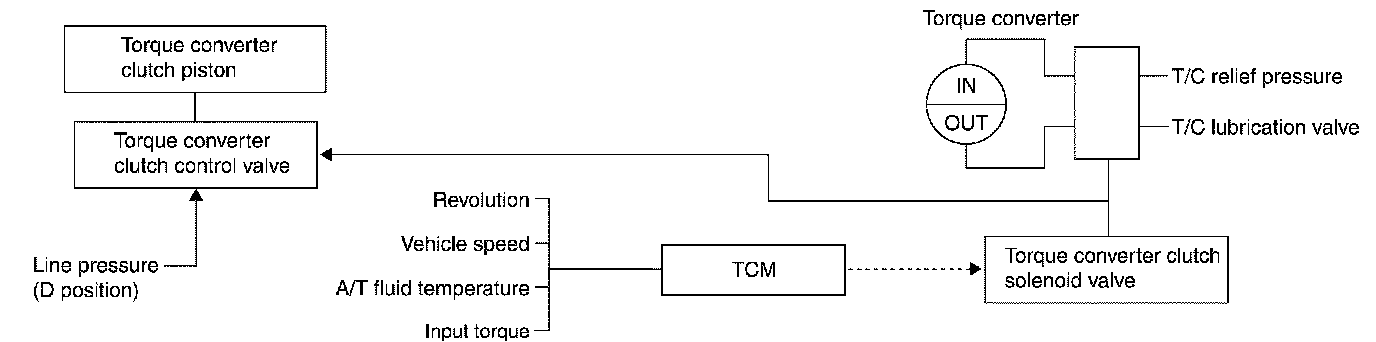 Lock-up ControlThe torque converter clutch piston in the torque converter is engaged to eliminate torque converter slip to increase power transmission efficiency. The torque converter clutch control valve operation is controlled by the torque converter clutch solenoid valve, which is controlled by a signal from TCM and the torque converter clutch control valve engages or releases the torque converter clutch piston.