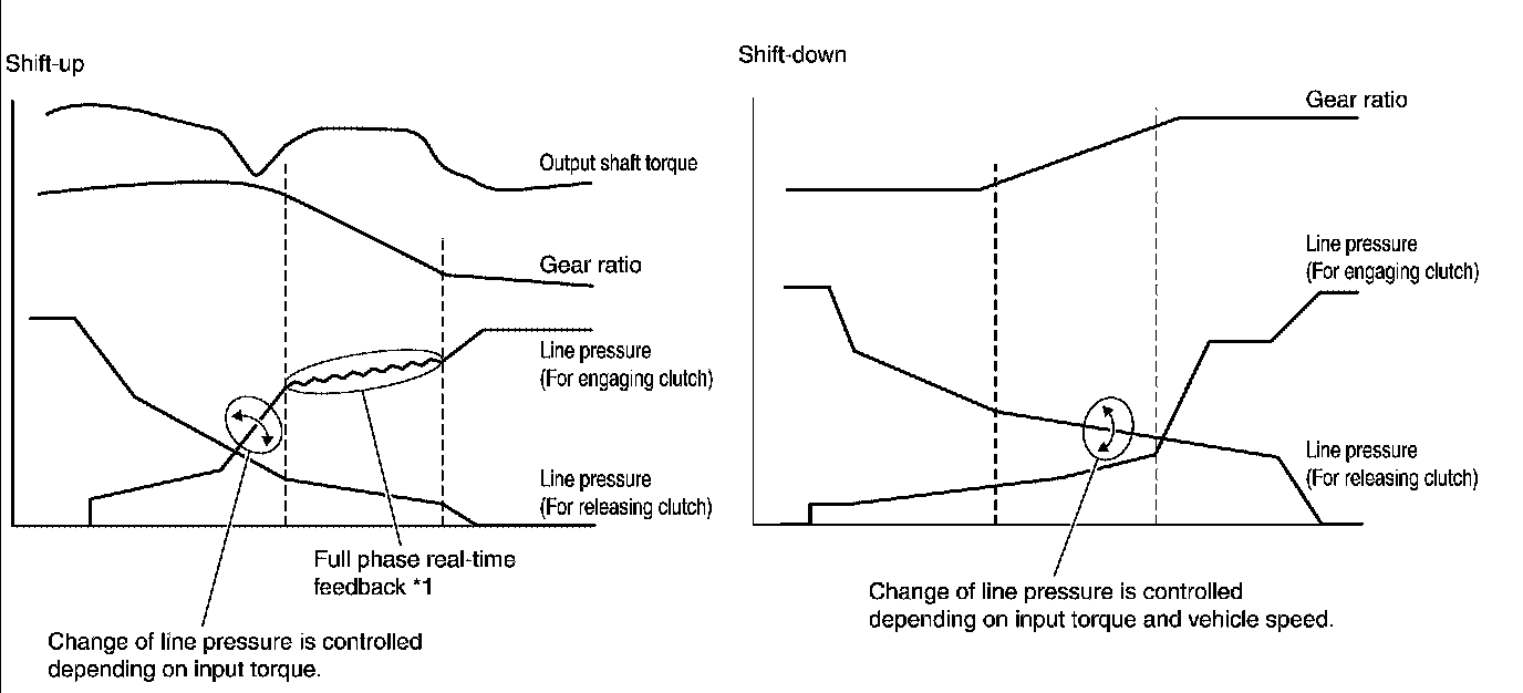 *1: Full phase real-time feedback control monitors movement of gear ratio at gear change, and controls oil pressure at real-time to achieve the best gear ratio.