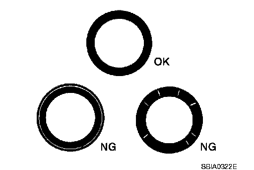 ^ If not, grind to adjust valve fitting and check again. If the contacting surface still has NG conditions even after the re-check, replace valve seat. Refer to VALVE SEAT REPLACEMENT.