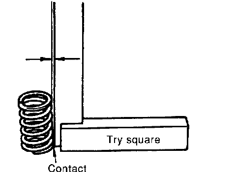 ^ Set a try square along the side of valve spring and rotate valve spring. Measure the maximum clearance between the top of valve spring and try square.