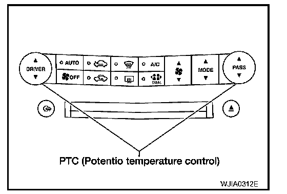 The PTC is built into the A/C switch. It can be set at an interval of 0.5 °C (1.0 °F) in the 18 °C (60 °F) to 32 °C (90 °F) temperature range by pressing the temperature switch. The set temperature is displayed.