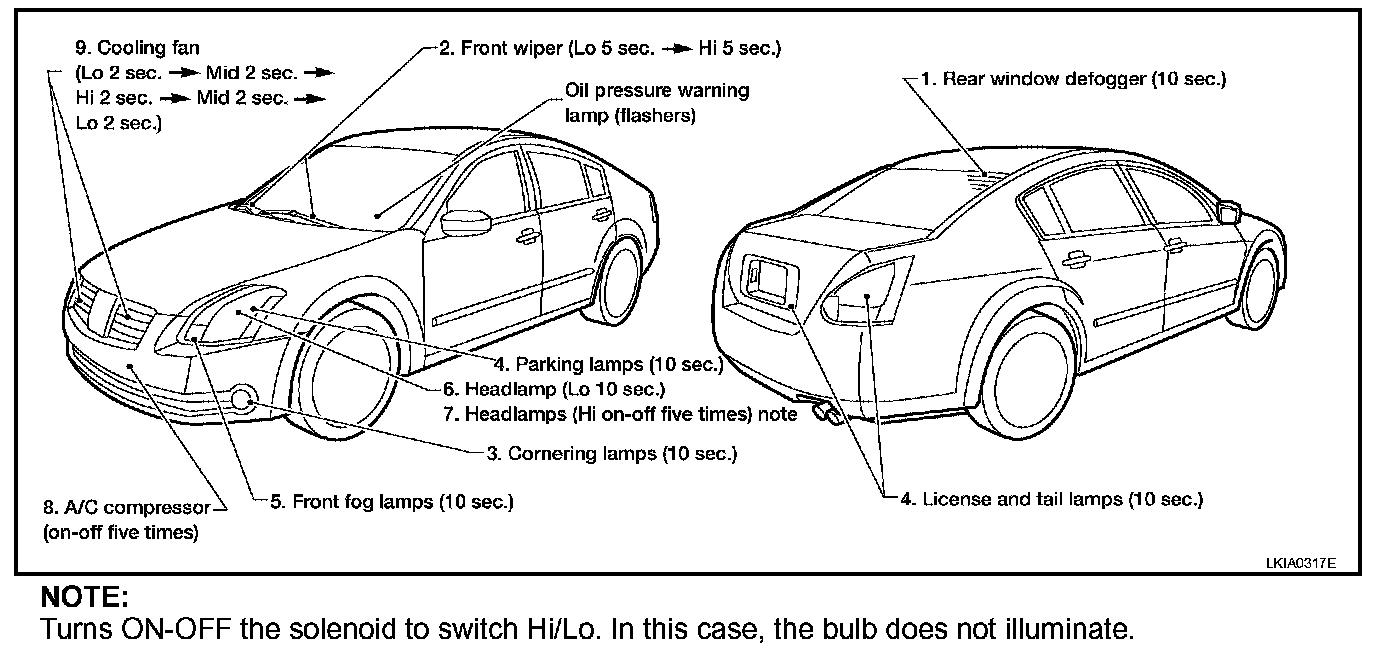 - In auto active test mode, operation inspection can be performed when IPDM E/R sends a drive signal to the following systems: