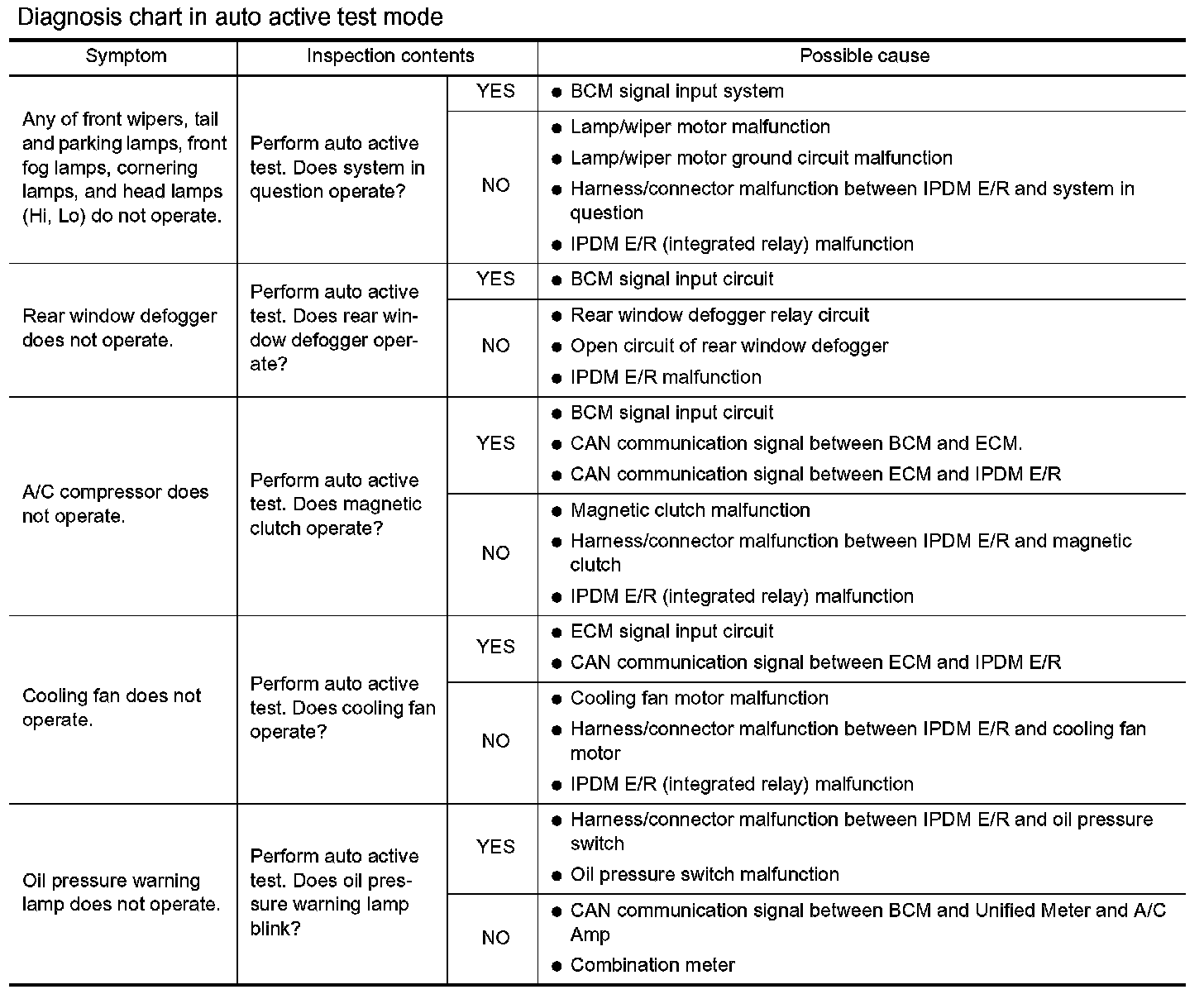 - If any of the systems controlled by IPDM E/R cannot be operated, possible cause can be easily diagnosed using auto active test.