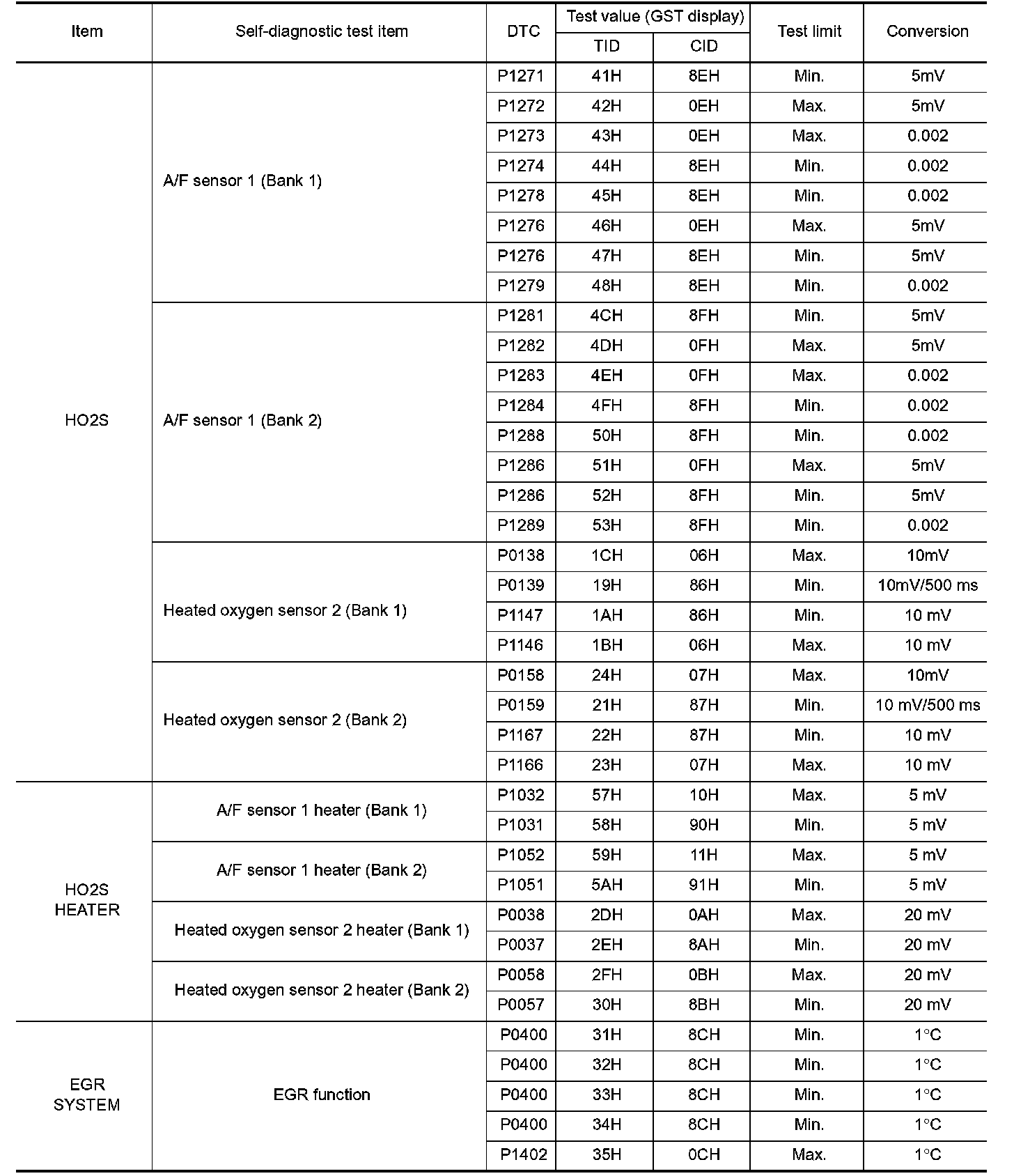 The test value is a parameter used to determine whether a system/circuit diagnostic test is OK or NG while being monitored by the ECM during self-diagnosis. The test limit is a reference value which is specified as the maximum or minimum value and is compared with the test value being monitored.