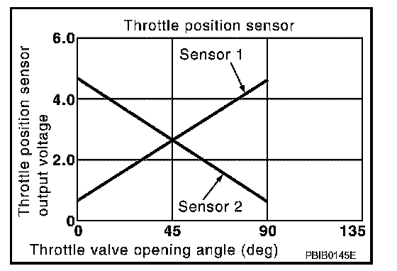 The throttle position sensor has the two sensors. These sensors are a kind of potentiometers which transform the throttle valve position into output voltage, and emit the voltage signal to the ECM. In addition, these sensors detect the opening and closing speed of the throttle valve and feed the voltage signals to the ECM. The ECM judges the current opening angle of the throttle valve from these signals and the ECM controls the throttle control motor to make the throttle valve opening angle properly in response to driving condition.