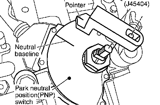 6. Adjust park/neutral position (PNP) switch so that alignment tool (J-45404) pointer aligns with neutral base line on park/neutral position (PNP) switch body.