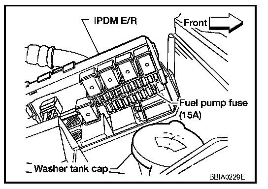 7. Remove fuel pump fuse located in IPDM E/R to release fuel pressure.