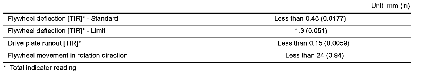 Drive plate runout [TIR]* Less than 0.15 (0.0059)