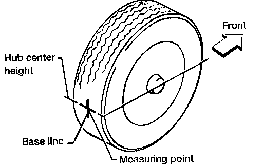 3. Put a mark on base line of the tread (rear side) of both front tires at the same height as hub center as shown. These marks are measuring points.
