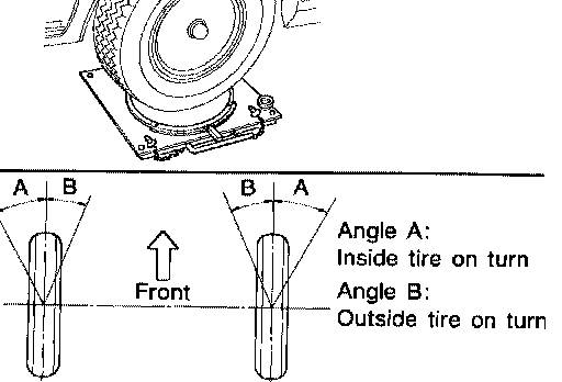 2. Rotate steering wheel all the way right and left; measure the turning angles "A" and "B" as shown.