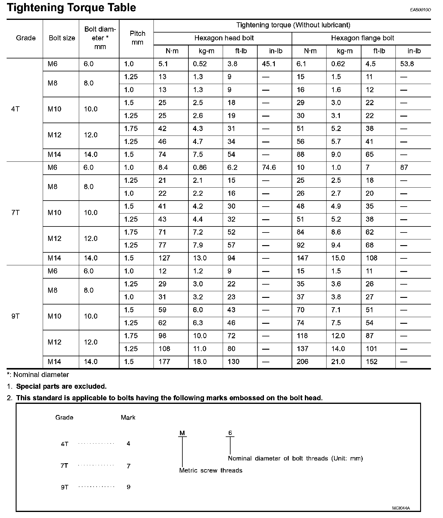 Tightening Torque Of Standard Bolts: