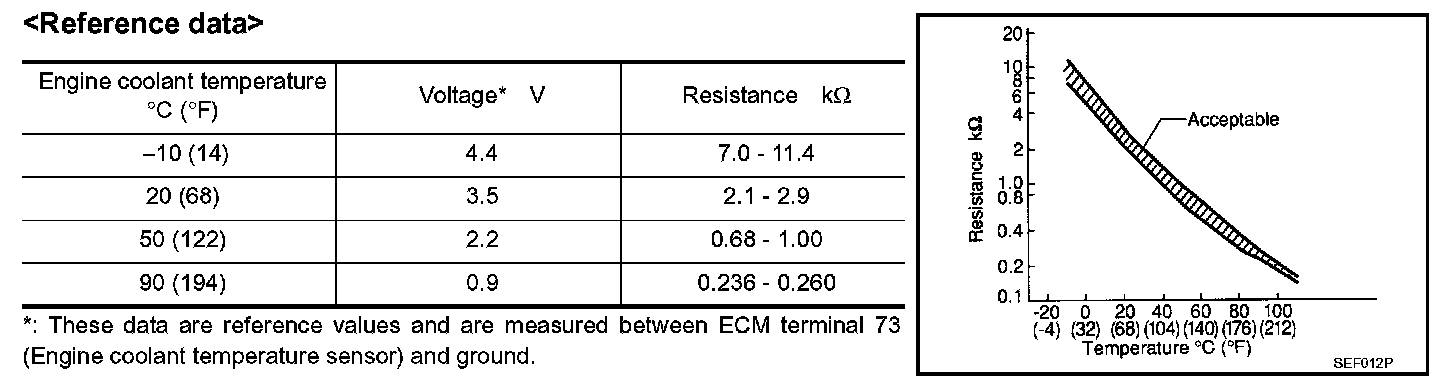 The engine coolant temperature sensor is used to detect the engine coolant temperature. The sensor modifies a voltage signal from the ECM. The modified signal returns to the ECM as the engine coolant temperature input. The sensor uses a thermistor which is sensitive to the change in temperature. The electrical resistance of the thermistor decreases as temperature increases.