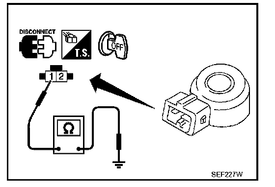 Check resistance between knock sensor terminal 1 and ground.
