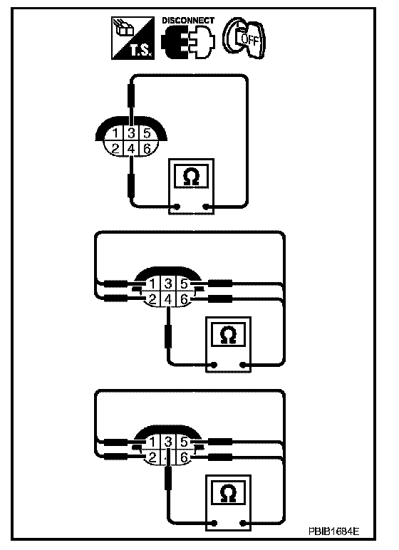 Check continuity between terminals 3 and 1, 2, 5, 6, terminals 4 and 1, 2, 5, 6.