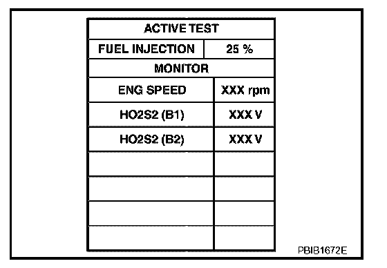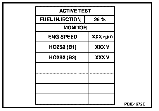 6. Check "HO2S2 (B1)/(B2)" at idle speed when adjusting "FUEL INJECTION" to ±25%.