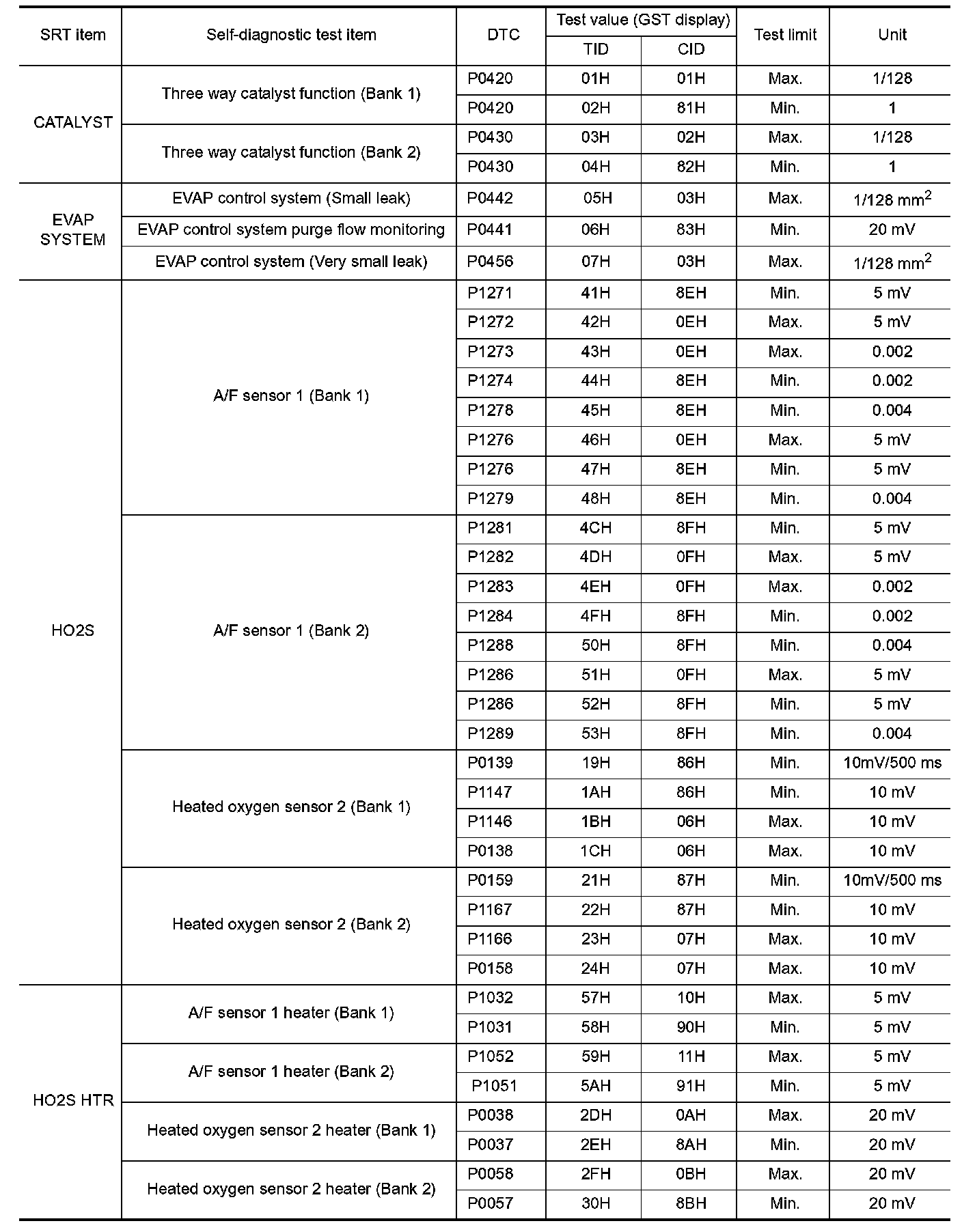 The test value is a parameter used to determine whether a system/circuit diagnostic test is OK or NG while being monitored by the ECM during self-diagnosis. The test limit is a reference value which is specified as the maximum or minimum value and is compared with the test value being monitored.