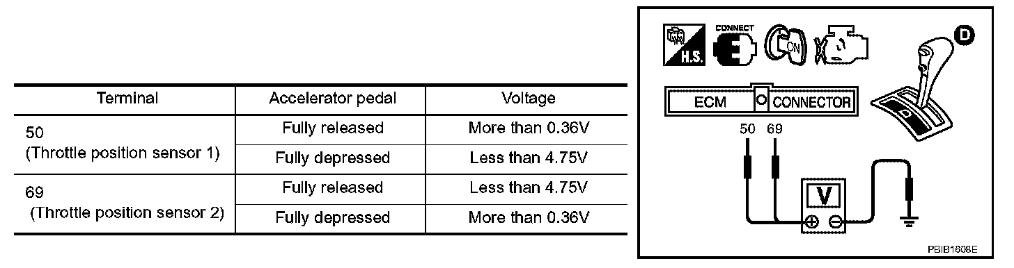 5. Check voltage between ECM terminals 50 (TP sensor 1 signal), 69 (TP sensor 2 signal) and ground under the given conditions.